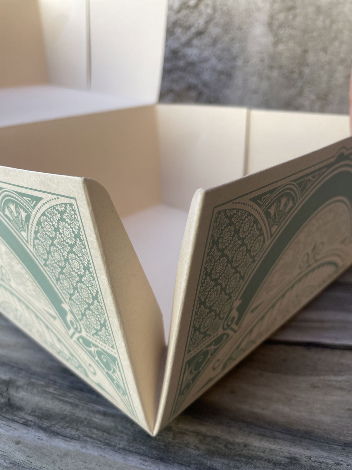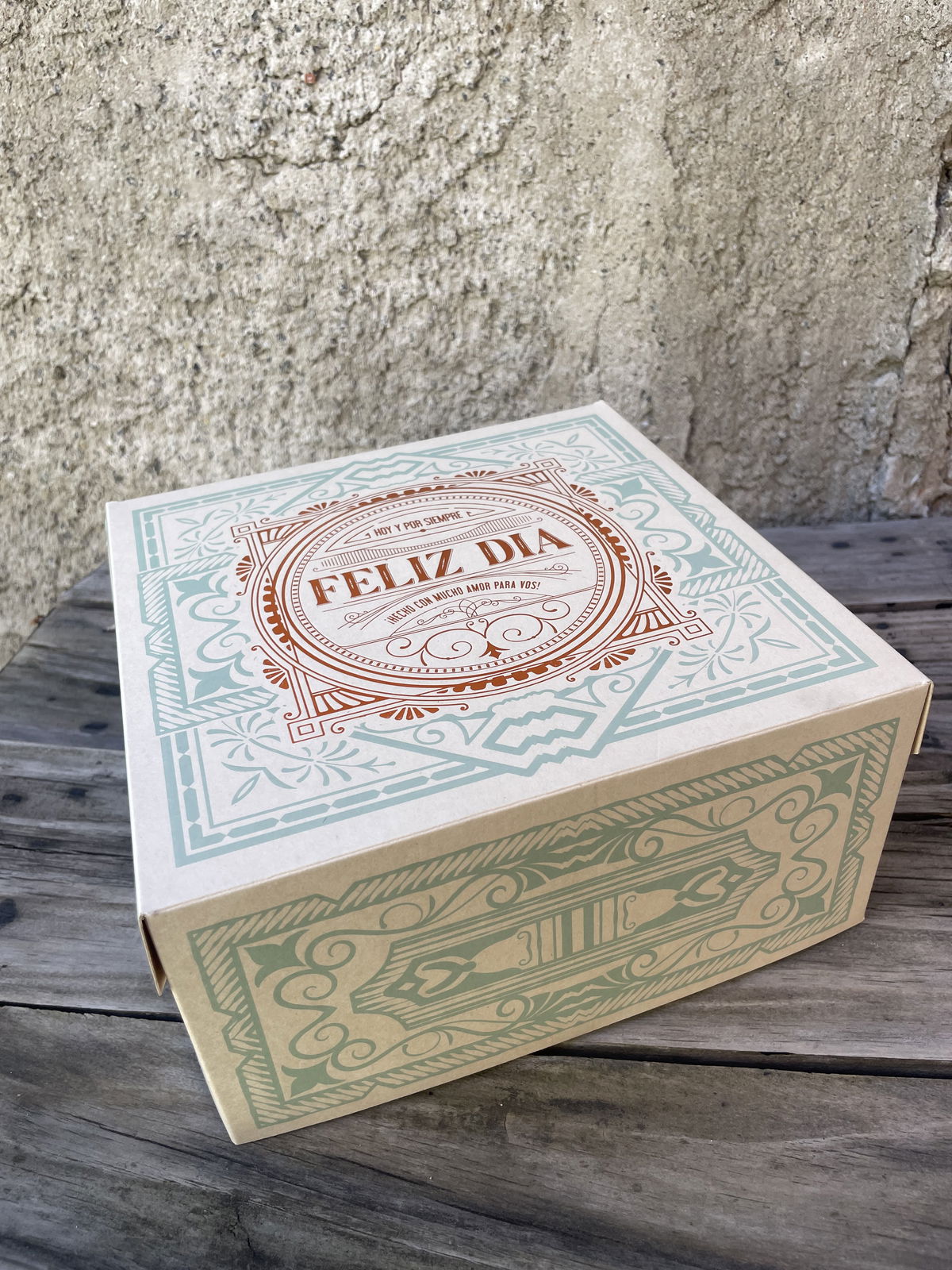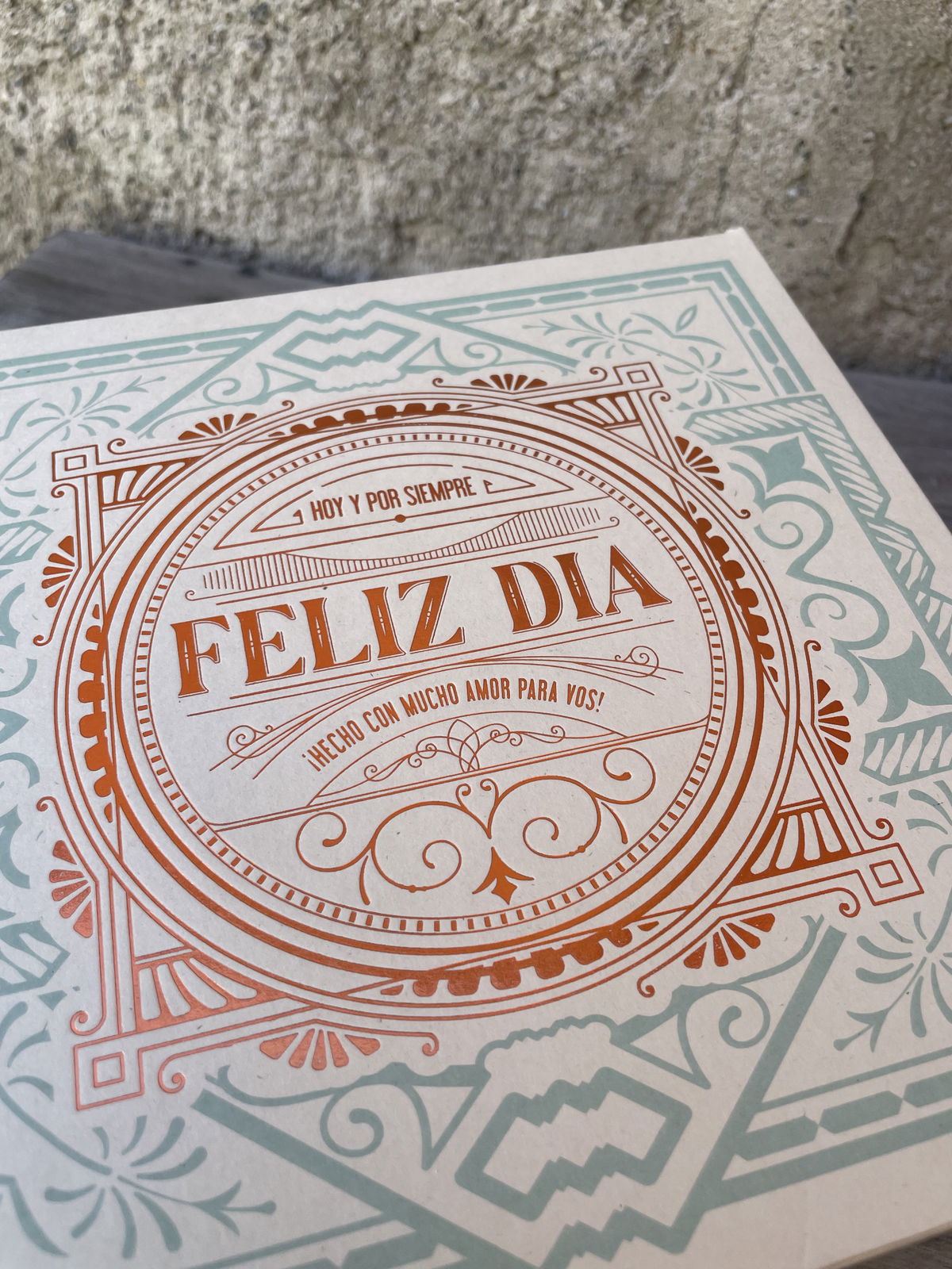 Con tapa bisagra y estampa Feliz Dia en dorado